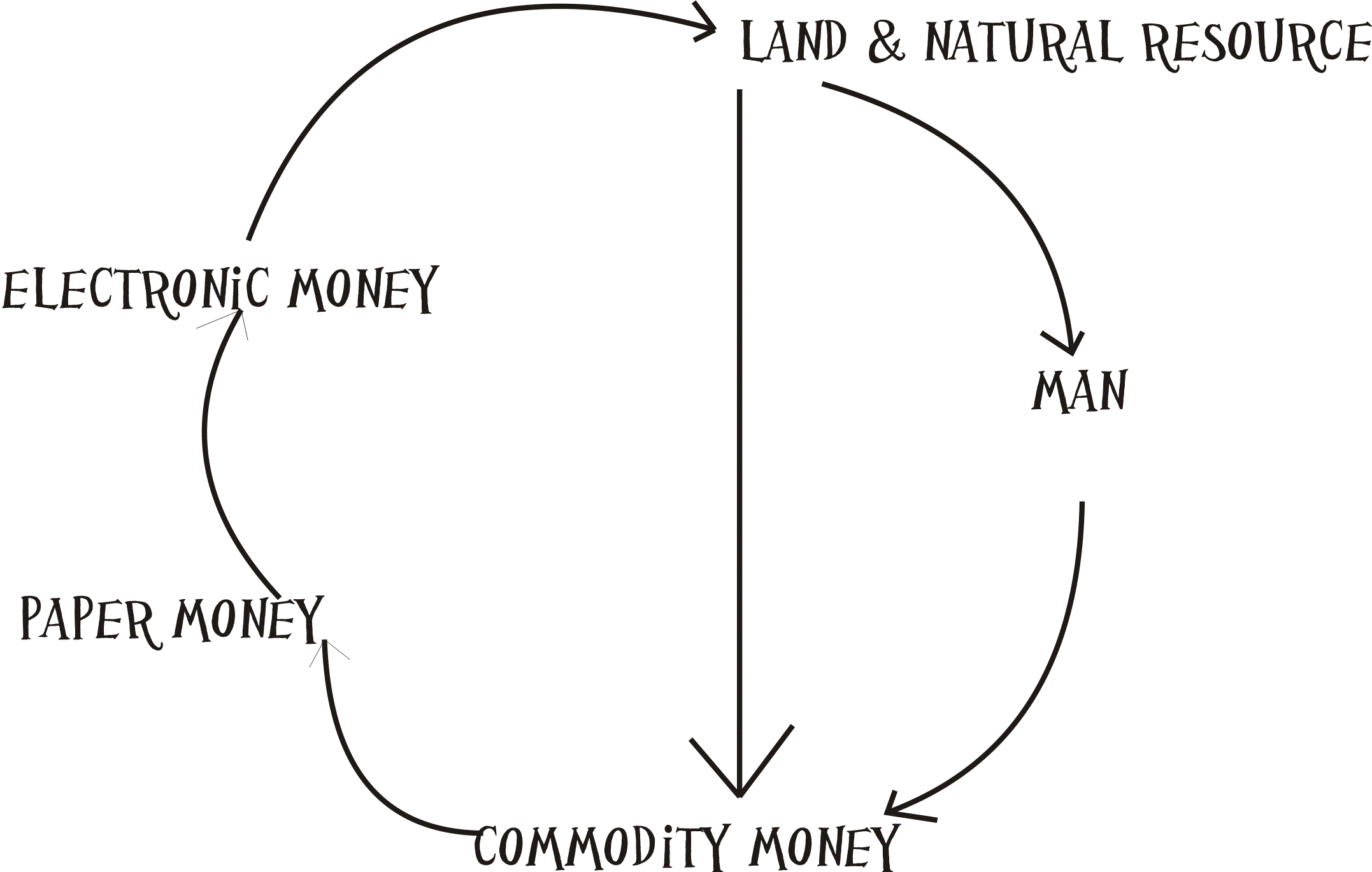 No prosperity can be sustained without the Land and the resources it provides. Better and easier ways of production and enrichment can be developed from the land and products of land use but all can be traced back to the land as seen in this diagram from the Book “The Right of be wrong; humanities only plea and the key to Revival”.