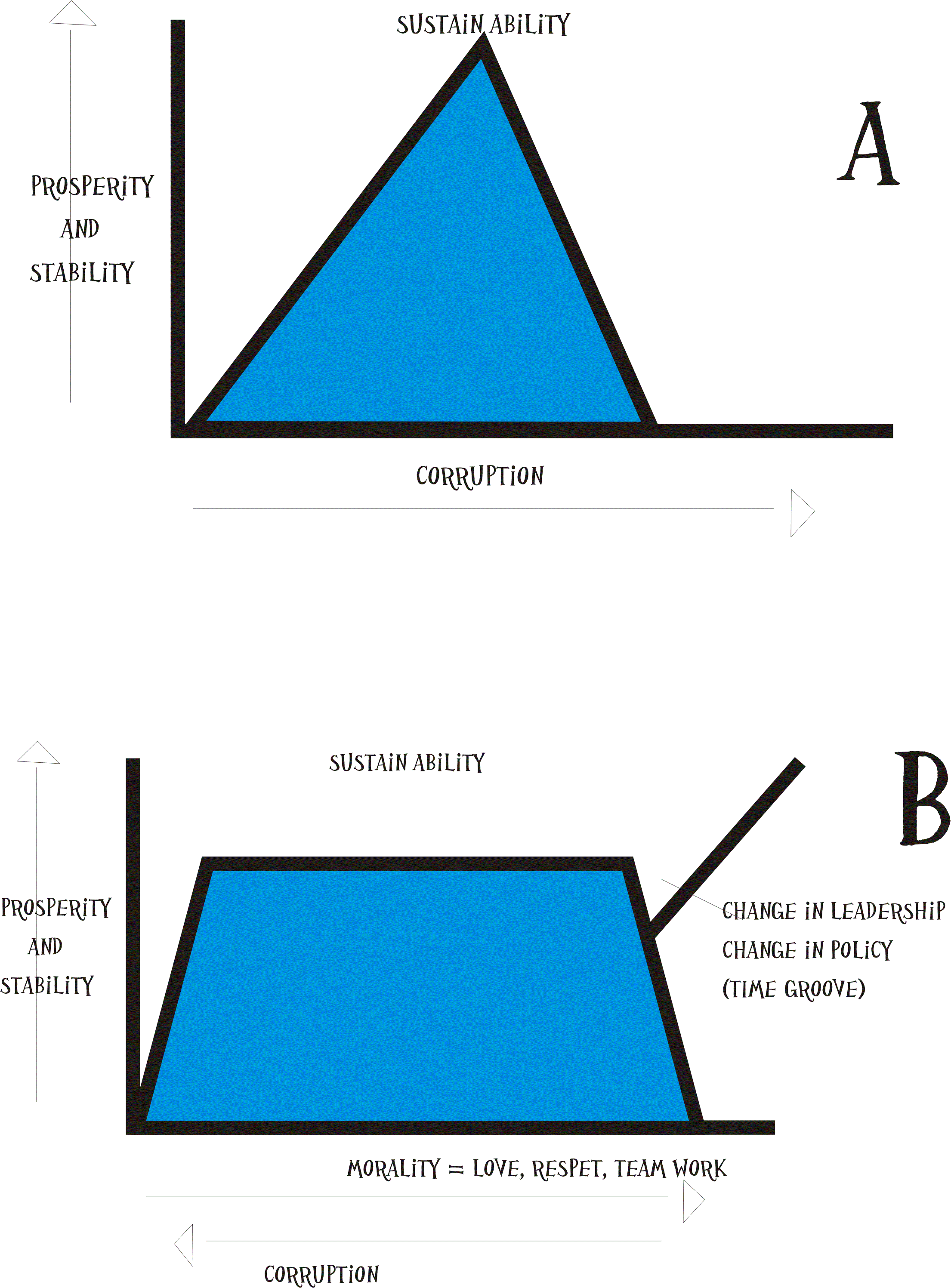 When there is increase in corruption, the prosperity gained by any work done might be rapid, but the sustainability of economic prosperity, peace and stability in that society is always on a knife edge. In that case, at the point at which the people should be enjoying relative peace and stability, they are doomed to rapid decay and anarchy. The kingdom and society begins its fall immediately. That is what is depicted in diagram (A) above.